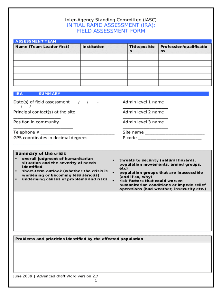 How to fill out INITIAL RAPID ASSESSMENT (IRA): AIDE MEMOIRE FOR FIELD TEAMS