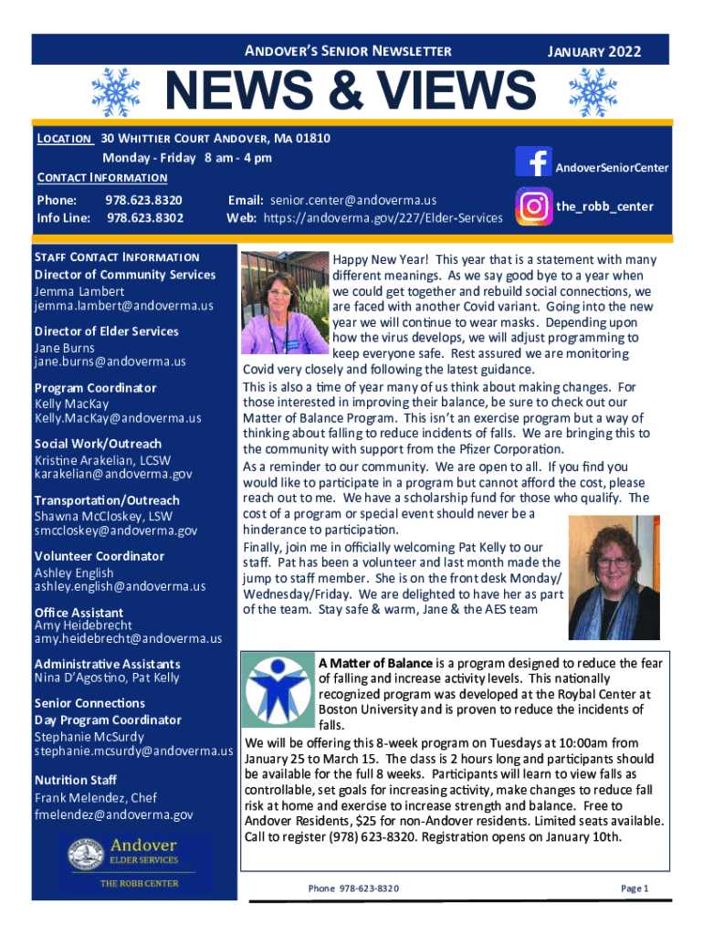 Handovers Senior Newsletters & VIEWS Location 30 Whittier Court Andover, Ma 01810 Monday Friday 8 am 4 pm Contact Information Phone: Info Line:978.623.8320 978.623.8302Staff Contact Information Director