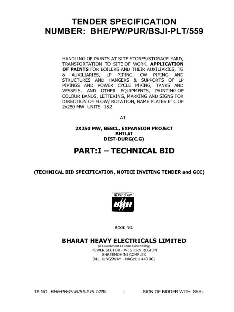 TENDER SPECIFICATION NUMBER: BHE/PW/PUR/BUILT/559 HANDLING OF PAINTS AT SITE STORES/STORAGE YARD, TRANSPORTATION TO SITE OF WORK, APPLICATION OF PAINTS FOR BOILERS AND THEIR AUXILIARIES, TG & AUXILIARIES,