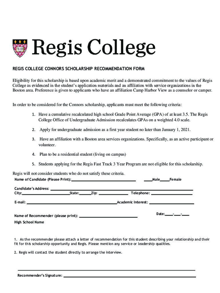 Students who are applying for scholarships at www.regiscollege.edu/sites/default/files/conners may need to fill out the scholarship recommendation form.