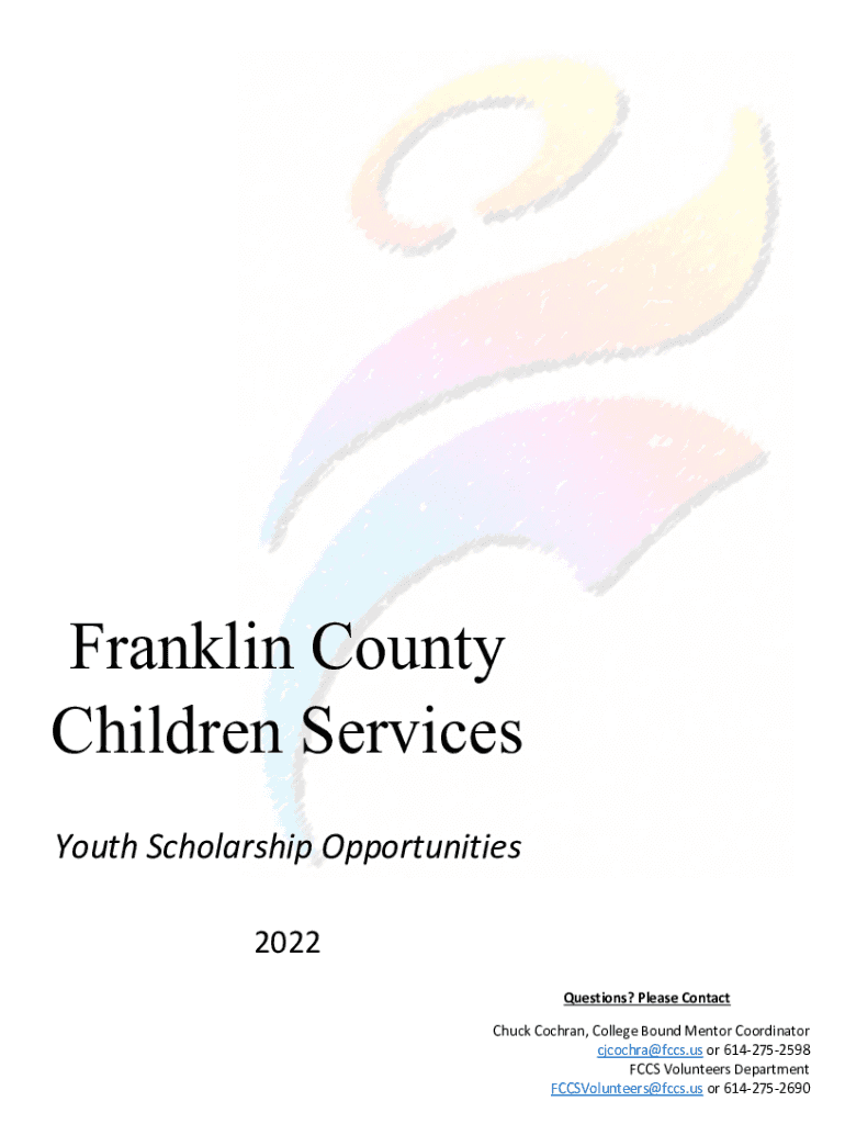 Franklin County Children Services YouthScholarshipOpportunities 2022 Questions? PleaseContact Chuck Cochran, CollegeBoundMentorCoordinator Cochran×FCC.usor6142752598 FCCSVolunteersDepartment FCCSVolunteers×FCC.usor6142752690Franklin