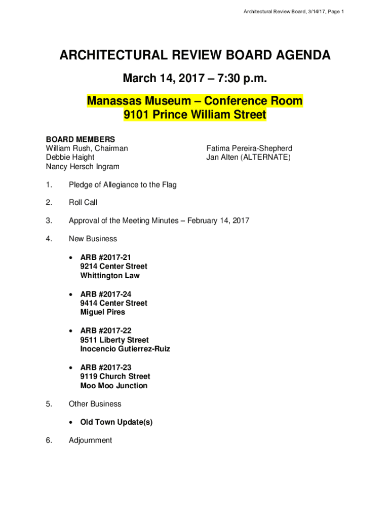 Architectural Review Board, 3/14/17, Page 1ARCHITECTURAL REVIEW BOARD AGENDA March 14, 2017 7:30 p.m. Manassas Museum Conference Room 9101 Prince William Street BOARD MEMBERS William Rush, Chairman