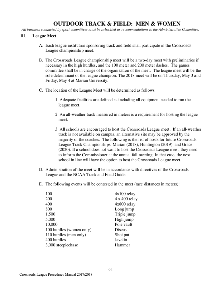 OUTDOOR TRACK & FIELD: MEN & WOMEN All business conducted by sport committees must be submitted as recommendations to the Administrative Committee.III. League Meet A. Each league institution sponsoring