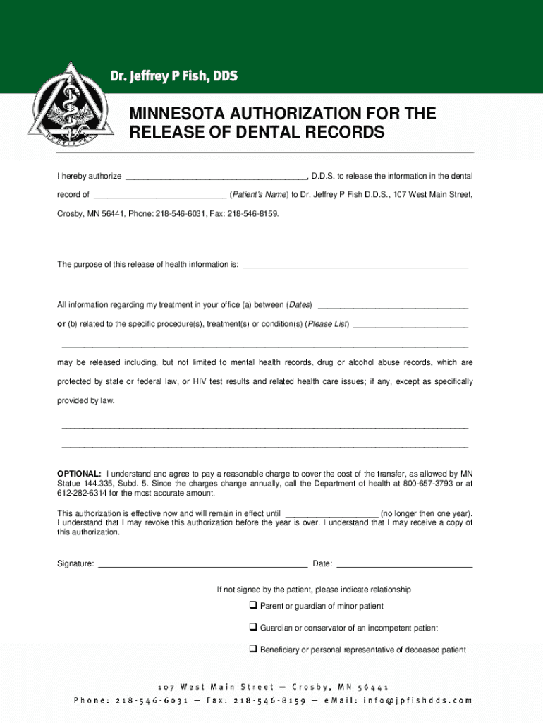 MINNESOTA AUTHORIZATION FOR THE RELEASE OF DENTAL RECORDS I hereby authorize ___, D.D.S. to release the information in the dental record of ___ (Patients Name) to Dr. Jeffrey P Fish D.D.S., 107 West