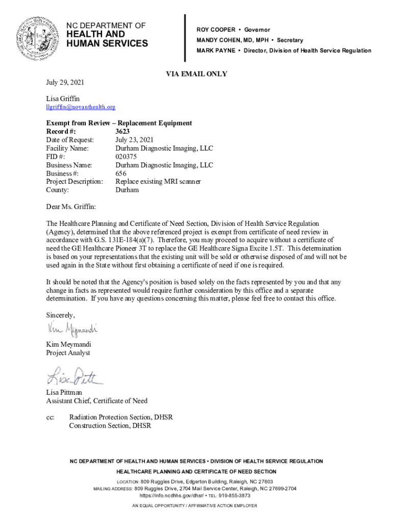 NC DEPARTMENT FROM COOPER GovernorHEALTH AND HUMAN SERVICEMAN COHEN, MD, MPH Secretary MARK PAYNE Director, Division of Health Service Regulation EMAIL ONLY July 29, 2021, Lisa Griffinllgriffin×novanthealth.exempt