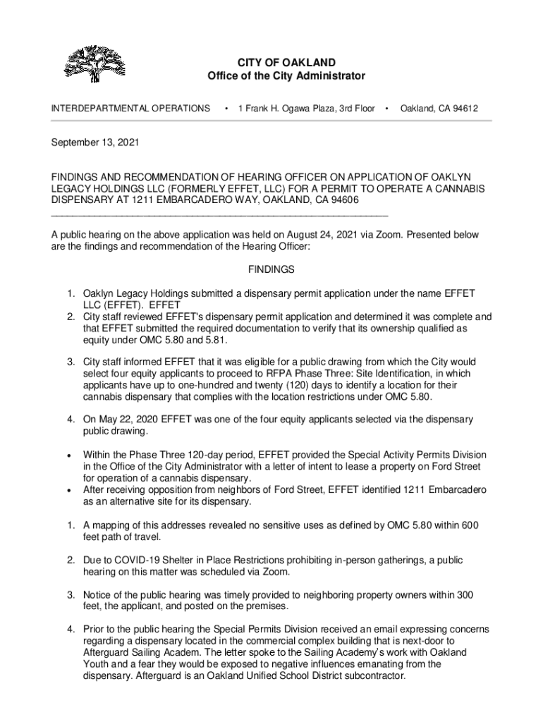 CITY OF OAKLAND Office of the City Administrator INTERDEPARTMENTAL OPERATIONS1 Frank H. Ottawa Plaza, 3rd Floor Oakland, CA 94612September 13, 2021FINDINGS AND RECOMMENDATION OF HEARING OFFICER ON