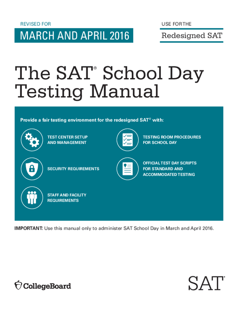 REVISED FOR USE FOR MARCH AND APRIL 2016Redesigned Sarthe SAT School Day Testing Manual Provide a fair testing environment for the redesigned SAT with: TEST CENTER SETUP AND MANAGEMENTTESTING ROOM