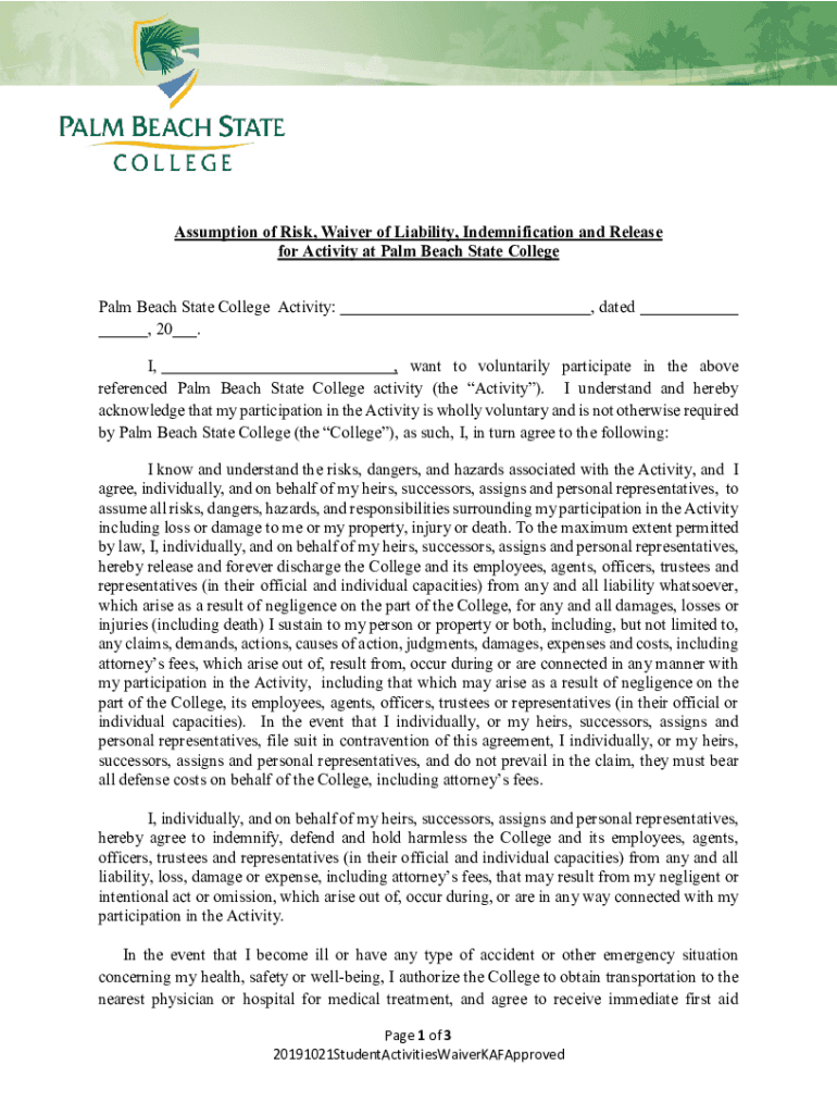 Assumption of Risk, Waiver of Liability, Indemnification and Release for Activity at Palm Beach State College Palm Beach State College Activity:, 20., dated, want to voluntarily participate in the