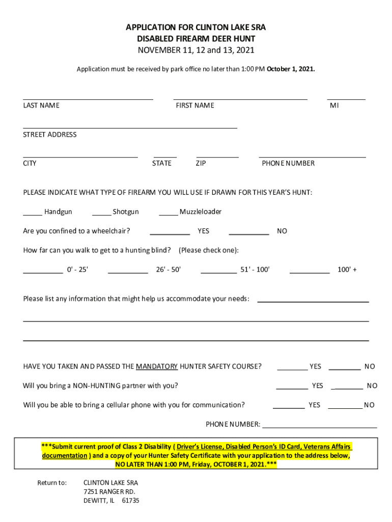 APPLICATION FOR CLINTON LAKE SRA DISABLED FIREARM DEER HUNT NOVEMBER 11, 12 and 13, 2021 Application must be received by park office no later than 1:00 PM October 1, 2021.___ LAST NAME___ FIRST NAME___