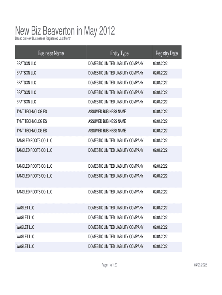 New Biz Beaverton in May 2012 Based on New Businesses Registered Last MonthBusiness Amenity TypeRegistry Reiteration DOMESTIC LIMITED LIABILITY COMPANY02/01/2022BRATSON DOMESTIC LIMITED LIABILITY