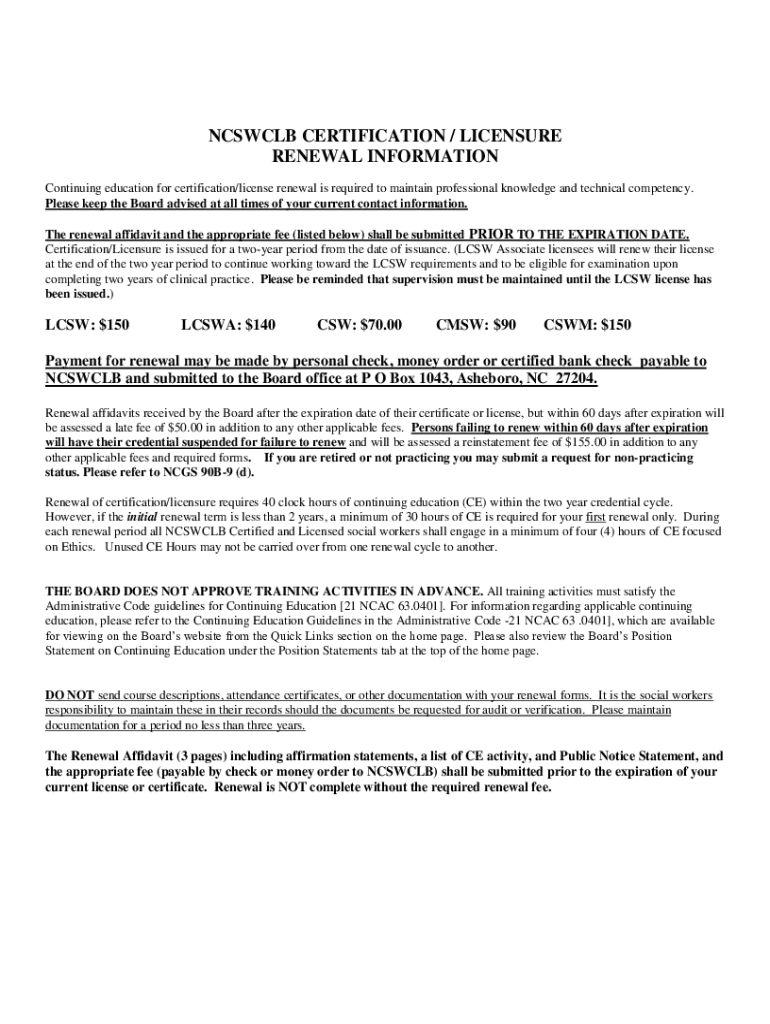 NCSWCLB CERTIFICATION / LICENSURE RENEWAL INFORMATION Continuing education for certification/license renewal is required to maintain professional knowledge and technical competency. Please keep the