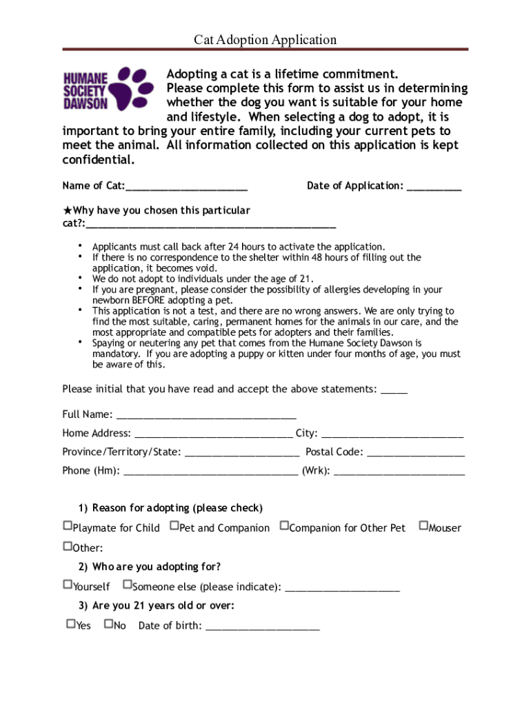 Cat Adoption Application Adopting a cat is a lifetime commitment. Please complete this form to assist us in determining whether the dog you want is suitable for your home and lifestyle. When selecting