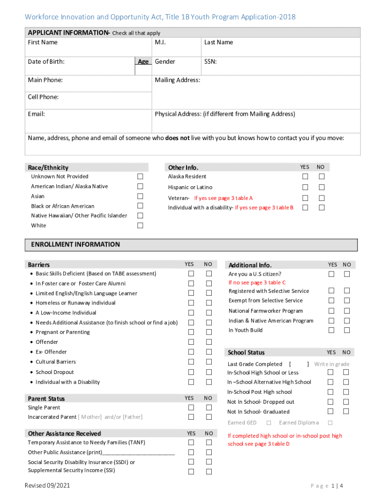 Workforce Innovation and Opportunity Act, Title 1B Youth Program Application2018 APPLICANT INFORMATION Check all that apply First Name. I. Last Damage Generate of Birth: Main Phone:SSN:Mailing Address:Cell