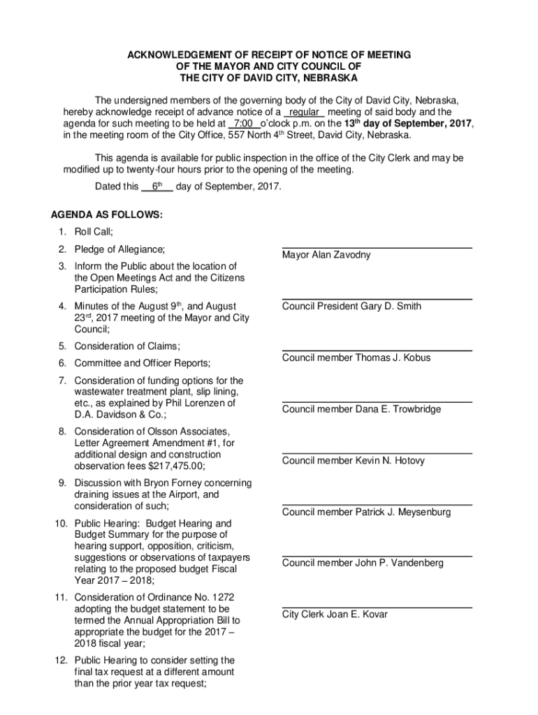 Get the free ACKNOWLEDGEMENT OF RECEIPT OF ... - David City, Nebraska