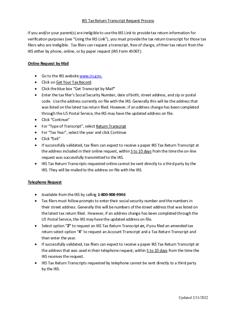 IRS Tax Return Transcript Request Process If you and/or your parent(s) are ineligible to use the IRS Link to provide tax return information for verification purposes (see Using the IRS Link), you