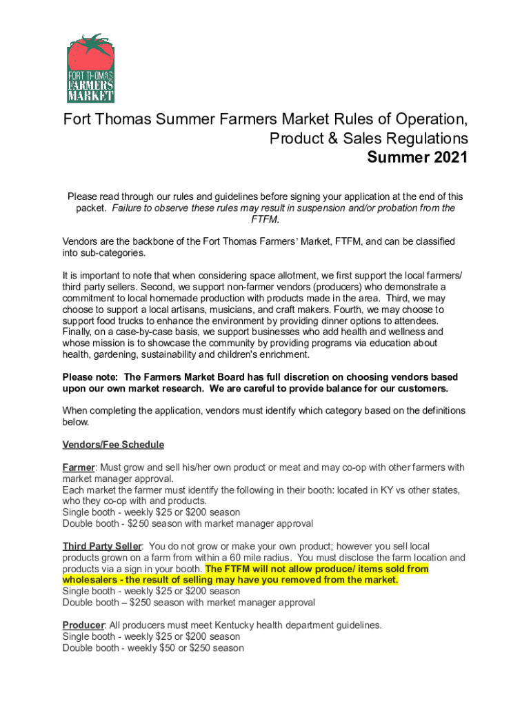 Fort Thomas Summer Farmers Market Rules of Operation, Product & Sales Regulations Summer 2021 Please read through our rules and guidelines before signing your application at the end of this packet.