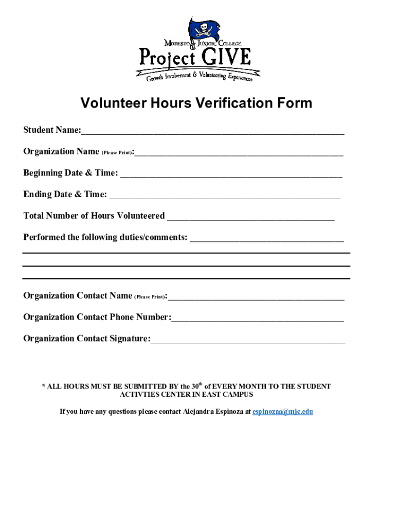 Volunteer Hours Verification Form Student Name:___ Organization Name (Please Print):___ Beginning Date & Time: ___ Ending Date & Time: ___ Total Number of Hours Volunteered ___ Performed the following
