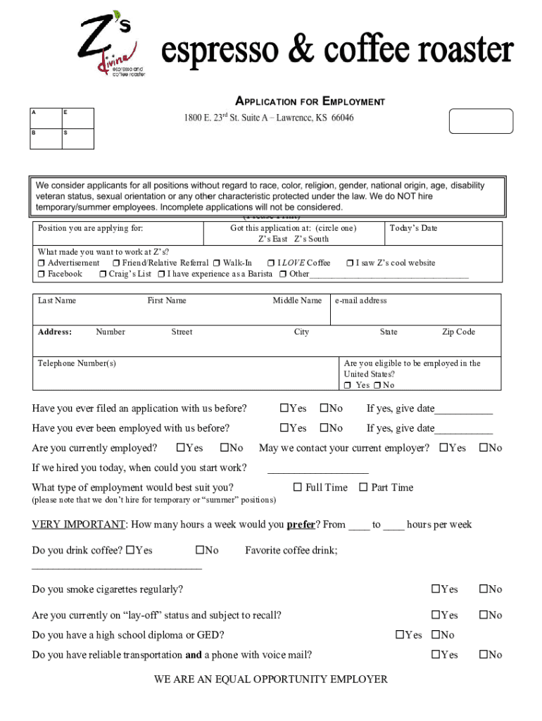 MISAPPLICATION FOR EMPLOYMENT(Please Print) Position you are applying for:Got this application at: (circle one) Zs East Zs SouthTodays Somewhat made you want to work at Zs? Advertisement Friend/Relative