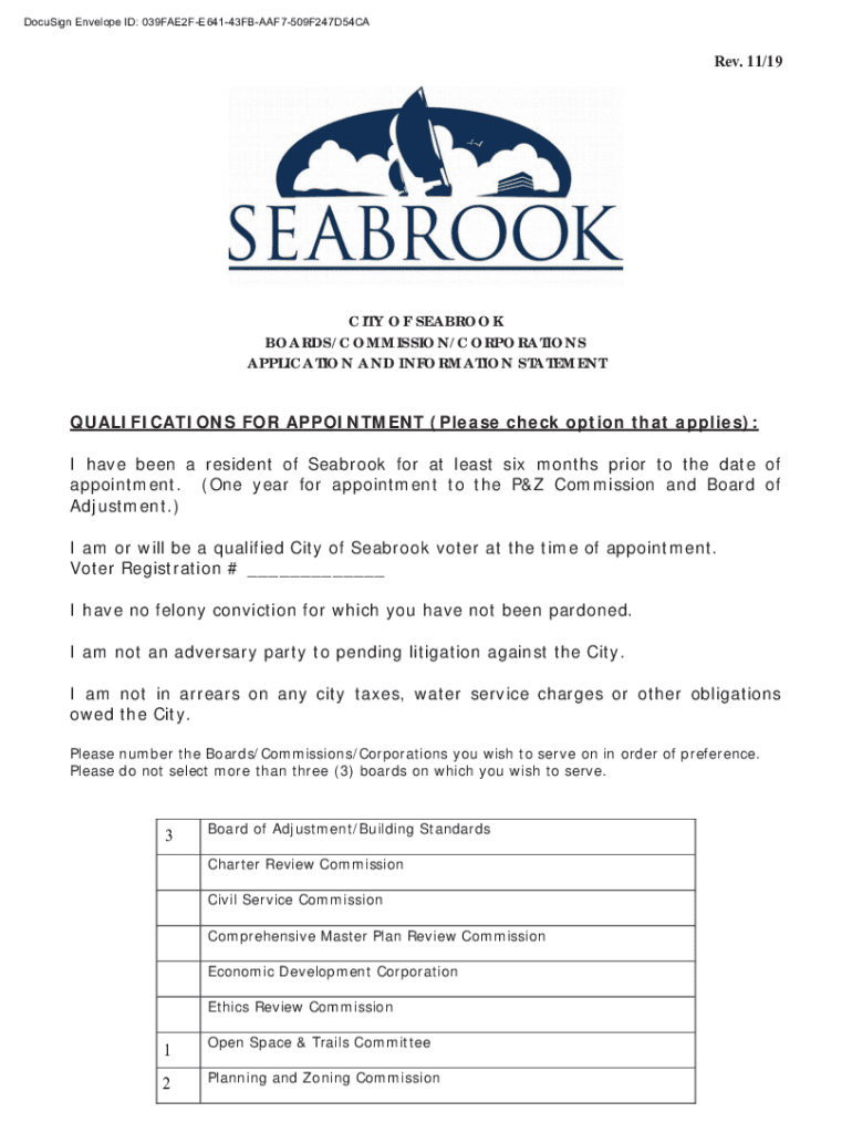 DocuSign Envelope ID: 039FAE2FE64143FBAAF7509F247D54CARev. 11/19CITY OF SEABROOK BOARDS/COMMISSION/CORPORATIONS APPLICATION AND INFORMATION STATEMENT QUALIFICATIONS FOR APPOINTMENT (Please check option