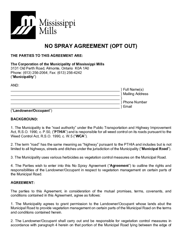 Get the free NO SPRAY AGREEMENT (OPT OUT) - Mississippi Mills, Ontario