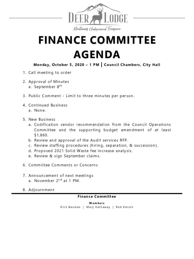 FINANCE COMMITTEE AGENDA Monday, October 5, 2020 1 PM×Council Chambers, City Hall1. Call meeting to or her 2. Approval of Minutes a. September 8 t h 3. Public Comment Limit to three minutes per son.