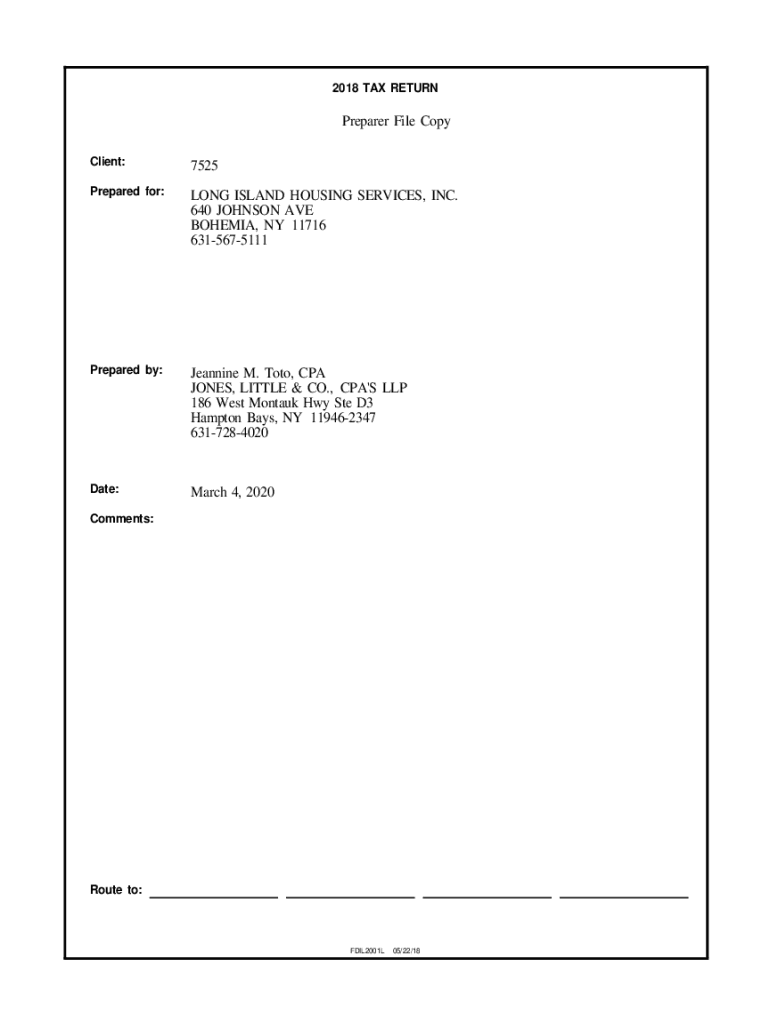 2018 TAX RETURNPreparer File Copy Client:7525Prepared for:LONG ISLAND HOUSING SERVICES, INC. 640 JOHNSON AVE BOHEMIA, NY 11716 6315675111Prepared by:Jeannine M. Toto, CPA JONES, LITTLE & CO., CPA\'S