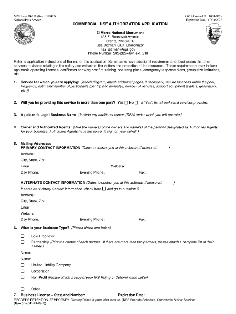 NPS Form 10550 (Rev. 01/2022) National Park Service OMB Control No. 10240268 Expiration Date: 10/31/2023COMMERCIAL USE AUTHORIZATION APPLICATION El Morro National Monument 123 E. Roosevelt Avenue