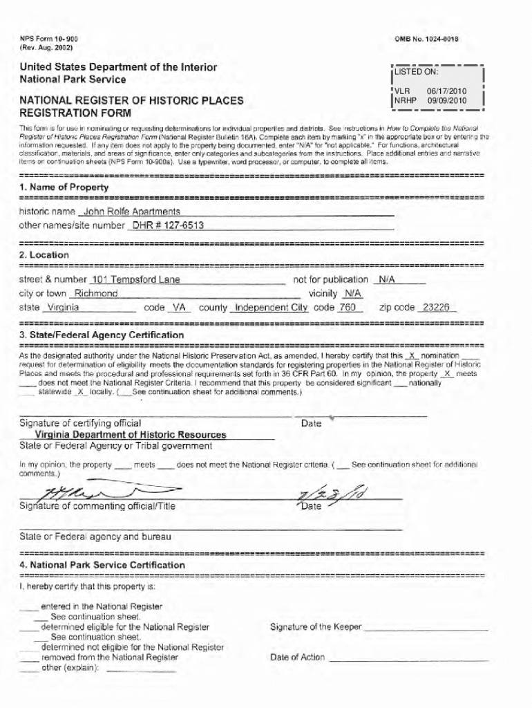 NPS Form 10 900 (Rev. Aug. 2002)OMB No. 10240018United States Department of the Interior National Park ServiceLISTED ON: SLR NRHPNATIONAL REGISTER OF HISTORIC PLACES REGISTRATION FORM06/17/2010 09/09/2010This