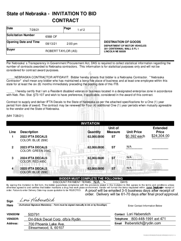 State of Nebraska INVITATION TO BID CONTRACT DatePage7/28/21Solicitation Number Opening Date and Time Buyer1 of 26568 OF 08/13/21DESTINATION OF GOODS2:00 department OF MOTOR VEHICLES 301 CENTENNIAL