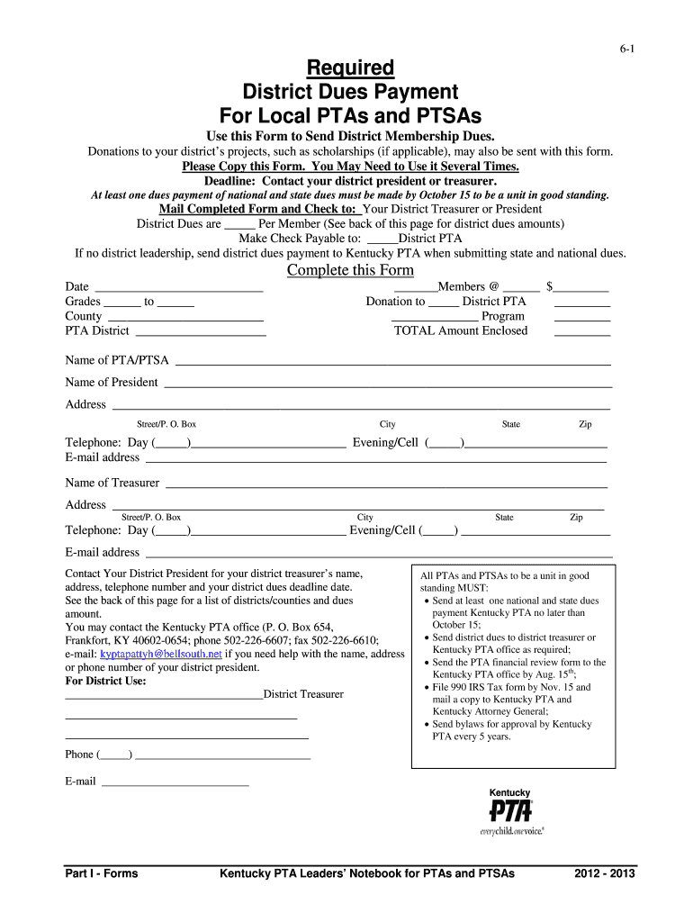 Part I Forms. Kentucky PTA Leaders' Notebook for PTA's and Pass. 2012 – 2013. Required. District Dues Payment. For Local PTA's and Pass. Use this Form ...