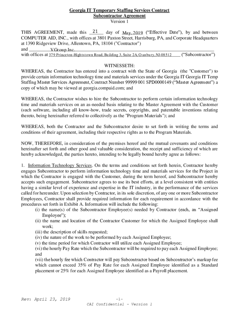 Georgia IT Temporary Staffing Services Contract Subcontractor Agreement Version 1 THIS AGREEMENT, made this ___ day of ___ (Effective Date), by and between COMPUTER AID, INC., with offices at 3801