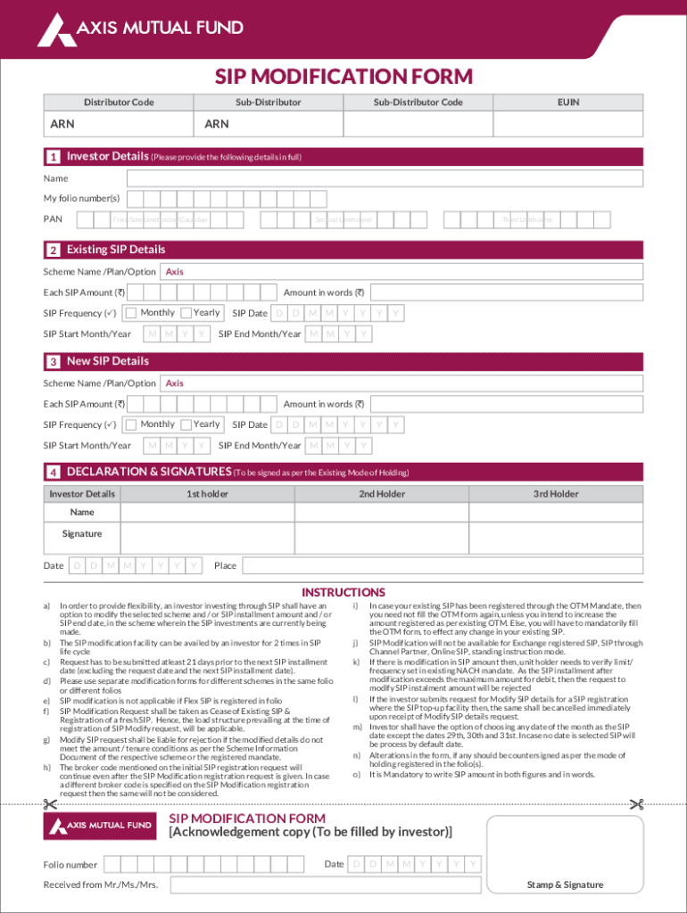 The sip modification-application-form is needed by individuals who already have an existing Systematic Investment Plan (SIP) and wish to make modifications to their current plan. It is specifically for those who want to change certain aspects of their SIP, such as investment amount, investment frequency, investment tenure, nominee details, or any other applicable modifications allowed by the SIP provider. It is important for individuals who wish to make changes to follow the proper process and fill out the modification application form accurately to ensure their requested modifications are implemented correctly.