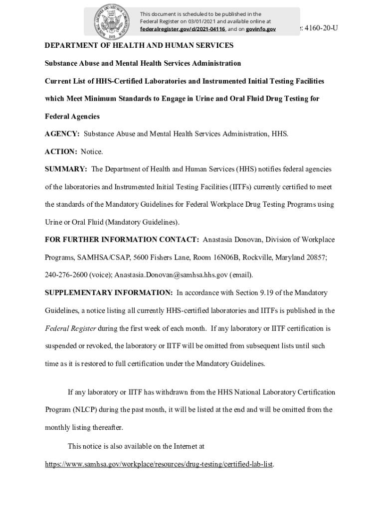 This document is scheduled to be published in the Federal Register on 03/01/2021 and available online at Billing federalregister.gov/d/202104116, and on gov info. Goode: 416020UDEPARTMENT OF HEALTH