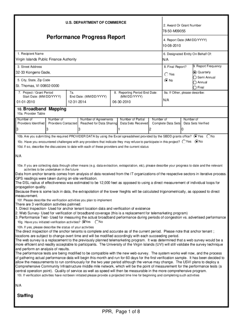 U.S. DEPARTMENT OF COMMERCE2. Award Or Grant Number7850M09055Performance Progress Report4. Report Date (MM/DD/YYY)10082010 1. Recipient Name6. Designated Entity On Behalf Of:Virgin Islands Public