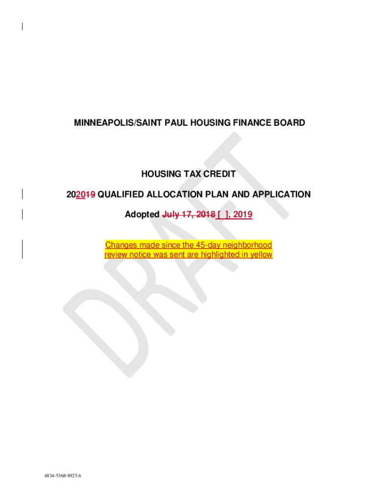 MINNEAPOLIS/SAINT PAUL HOUSING FINANCE WAREHOUSING TAX CREDIT 202019 QUALIFIED ALLOCATION PLAN AND APPLICATION Adopted July 17, 2018 [ ], 2019Changes made since the 45day neighborhood review notice