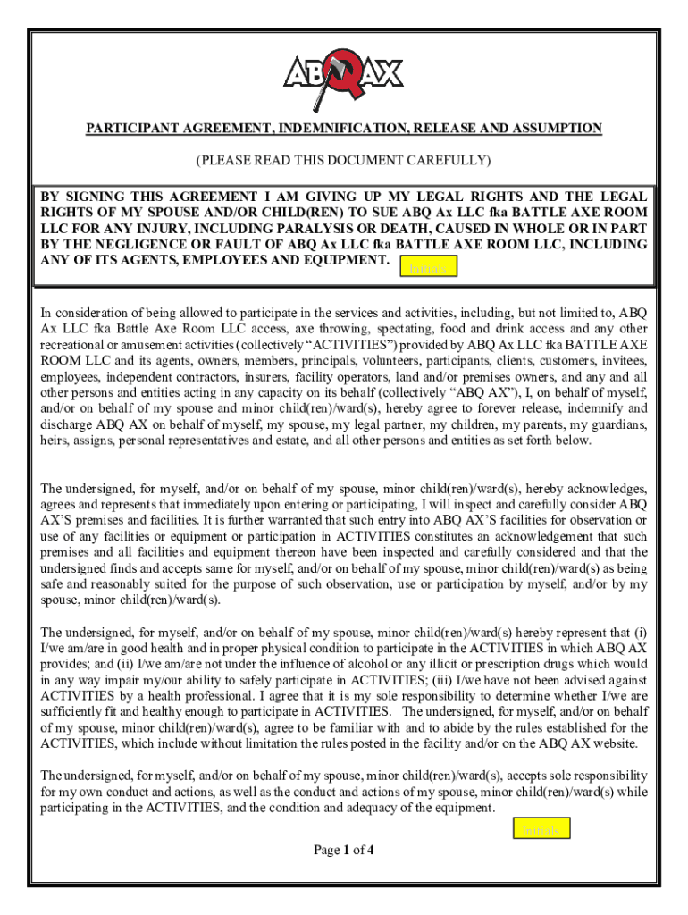 PARTICIPANT AGREEMENT, INDEMNIFICATION, RELEASE AND ASSUMPTION (PLEASE READ THIS DOCUMENT CAREFULLY) BY SIGNING THIS AGREEMENT I AM GIVING UP MY LEGAL RIGHTS AND THE LEGAL RIGHTS OF MY SPOUSE AND/OR