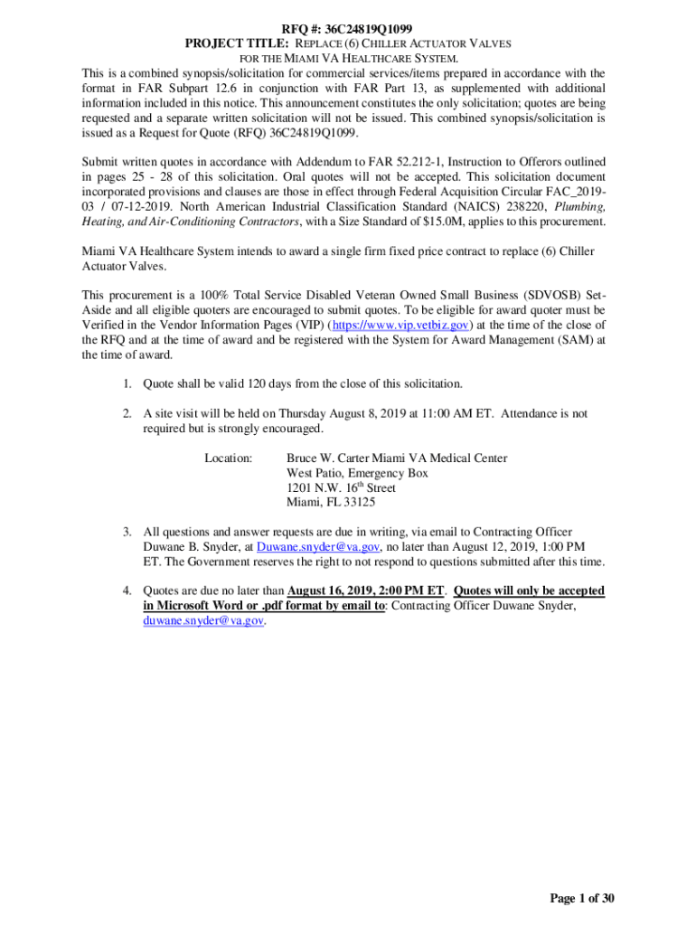 RFQ #: 36C24819Q1099 PROJECT TITLE: REPLACE (6) CHILLER ACTUATOR VALVES FOR THE MIAMI VA HEALTHCARE SYSTEM. This is a combined synopsis/solicitation for commercial services/items prepared in accordance