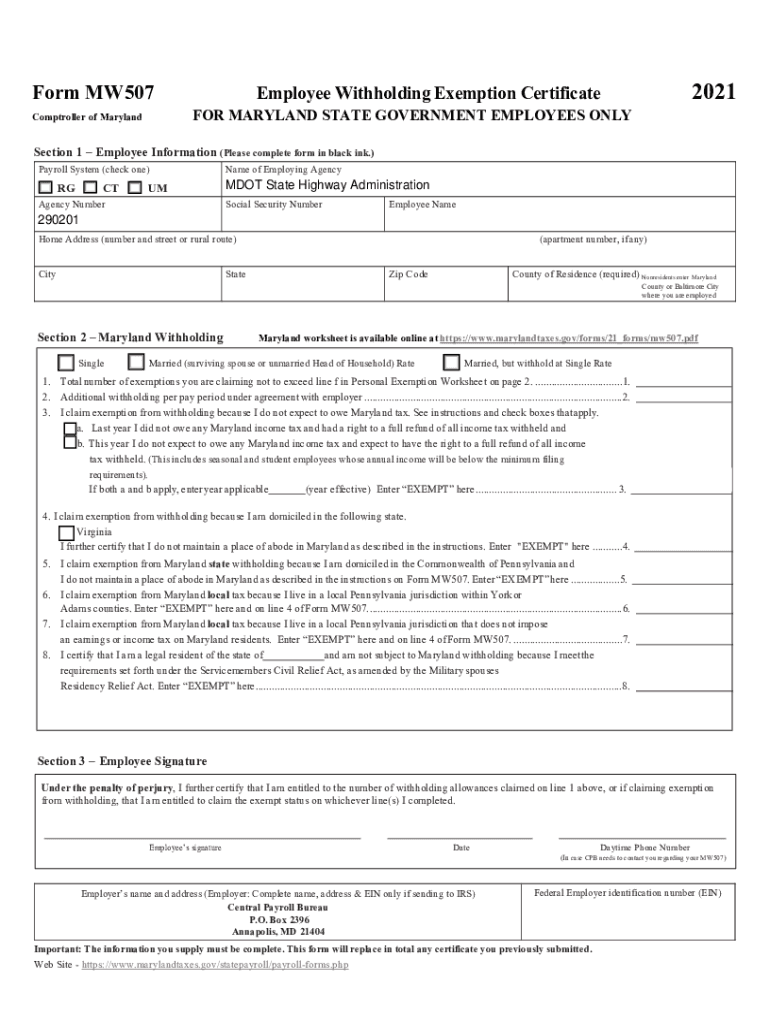 Form MW507 Comptroller of Maryland2021Employee Withholding Exemption Certificate MARYLAND STATE GOVERNMENT EMPLOYEES ONLYSection 1 Employee Information (Please complete form in black ink.) Payroll