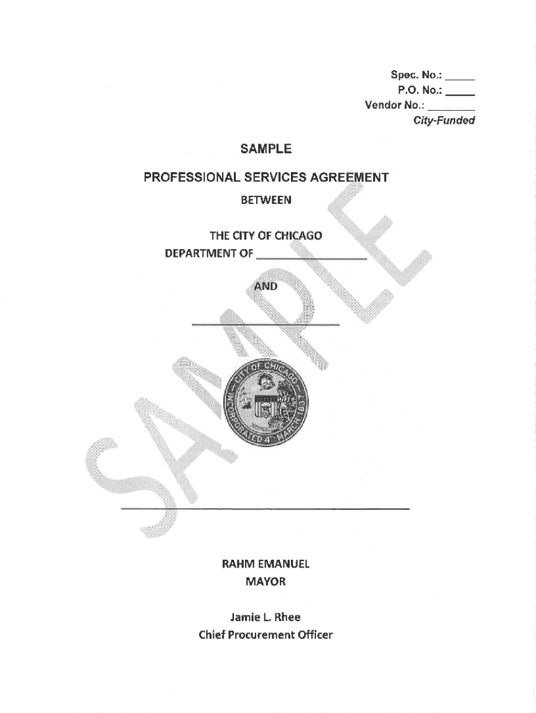 Spec. No.: _ P.O. No.: Vendor No.: CityFundedSAMPLE PROFESSIONAL SERVICES ARE BETWEEN CITY OF CHIoDEPARTMENT OI.RAM EMANUEL MAYOR Jamie L. Rhee Chief Procurement OfficerENTIS specific cat o n Title×,