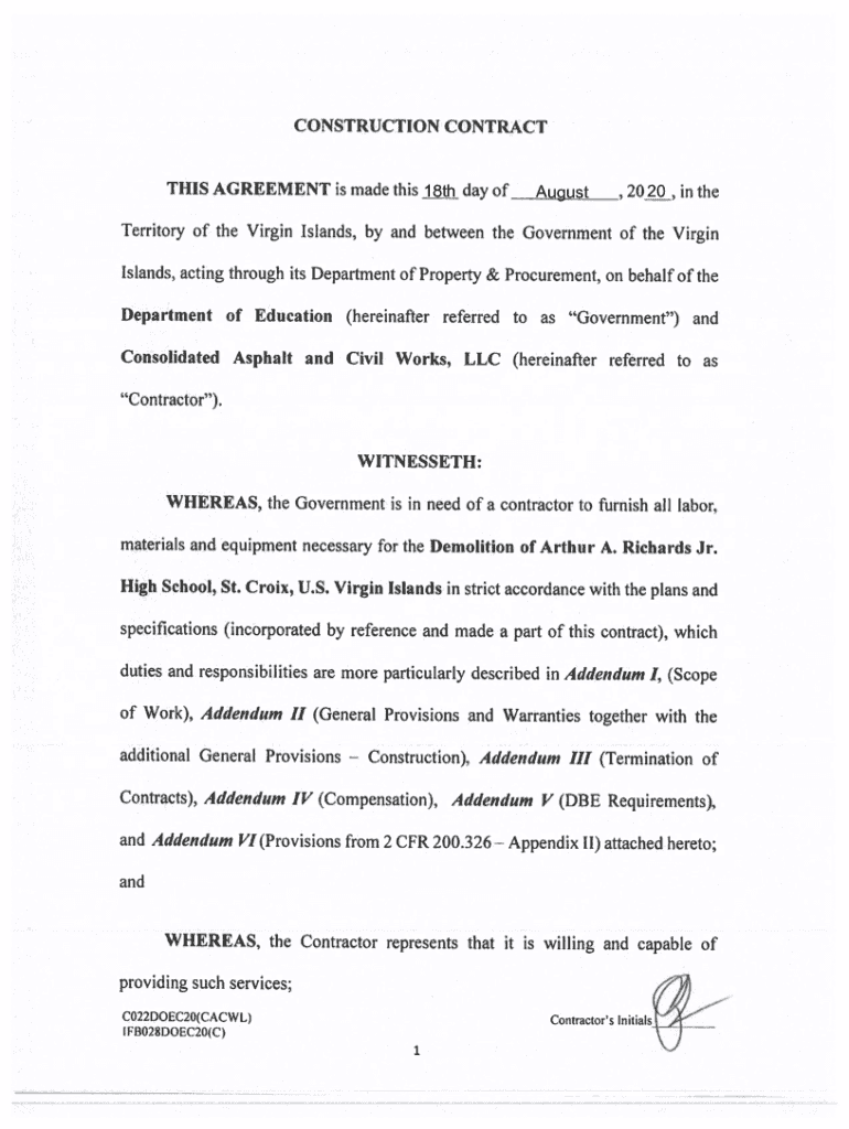 ___CONSTRUCTION CONTRACTS AGREEMENT is made this 18th day of August,20, 20 in territory of the Virgin Islands, by and between the Government of the Virgin Islands, acting through its Department of