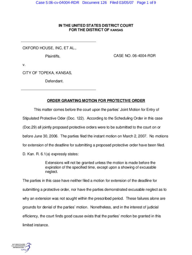 Case 5:06cv04004RDR Document 126 Filed 03/05/07-Page 1 of 9IN THE UNITED STATES DISTRICT COURT FOR THE DISTRICT OF KANSASOXFORD HOUSE, INC, ET AL., Plaintiffs, CASE NO. 064004RDRv. CITY OF TOPEKA,