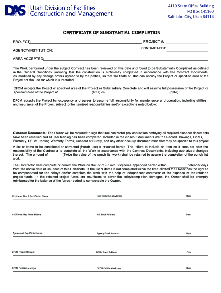 4110 State Office Building PO Box 141160 Salt Lake City, Utah 84114 Clear Fields CERTIFICATE OF SUBSTANTIAL COMPLETION PROJECT #:PROJECT:CONTRACT/PO#:AGENCY/INSTITUTION: AREA ACCEPTED:The Work performed