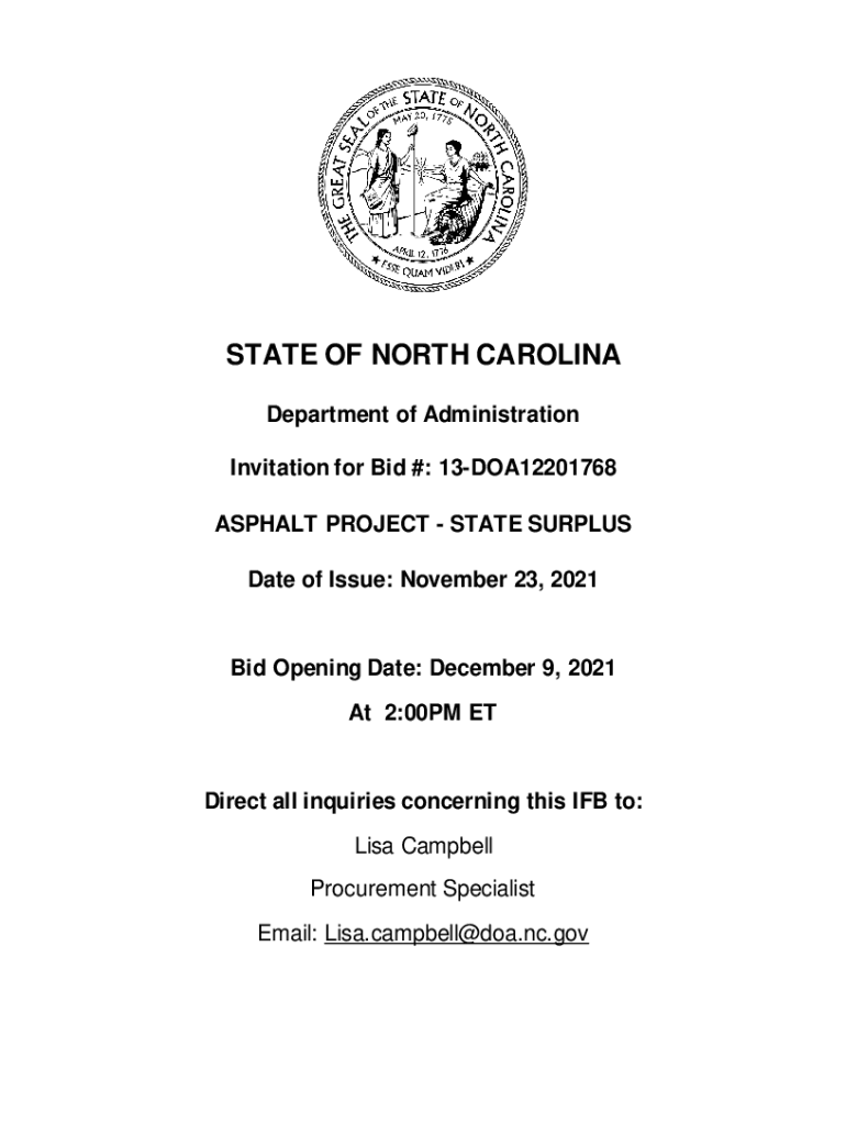 STATE OF NORTH CAROLINA Department of Administration Invitation for Bid #: 13DOA12201768 ASPHALT PROJECT STATE SURPLUS Date of Issue: November 23, 2021Bid Opening Date: December 9, 2021, At 2:00PM