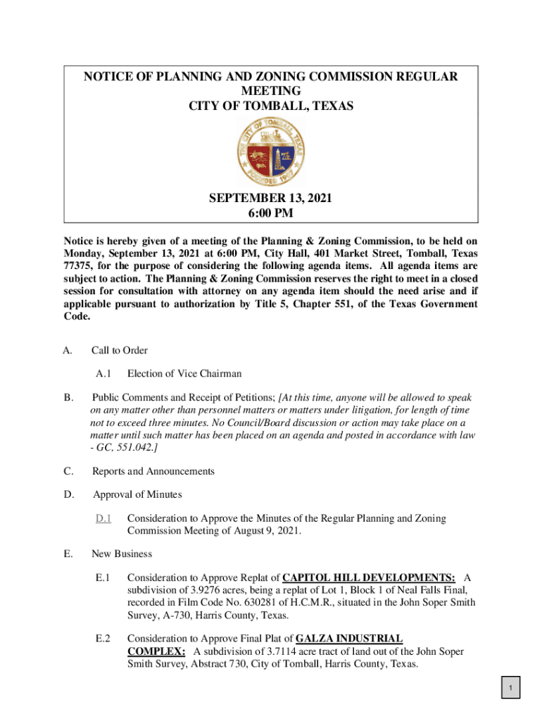 NOTICE OF PLANNING AND ZONING COMMISSION REGULAR MEETING CITY OF TOMB ALL, TEXASSEPTEMBER 13, 2021 6:00 PM Notice is hereby given of a meeting of the Planning & Zoning Commission, to be held on Monday,