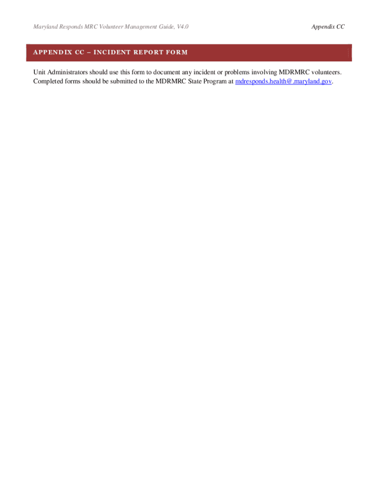 Maryland Responds MRC Volunteer Management Guide, V4.0Appendix APPENDIX CC INCIDENT REPORT Community Administrators should use this form to document any incident or problems involving MDR MRC volunteers.