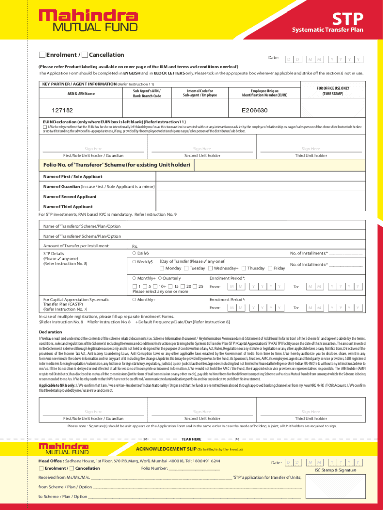 STP mutual unsystematic Transfer Plan Enrollment / CancellationDate:DDMMYYYY(Please refer Product labeling available on cover page of the KIM and terms and conditions overleaf) The Application Form