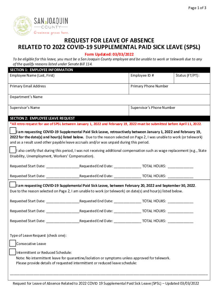 Page 1 of 3REQUEST FOR LEAVE OF ABSENCE RELATED TO 2022 COVID-19 SUPPLEMENTAL PAID SICK LEAVE (PSL) Form Updated: 03/03/2022 To be eligible for this leave, you must be a San Joaquin County employee
