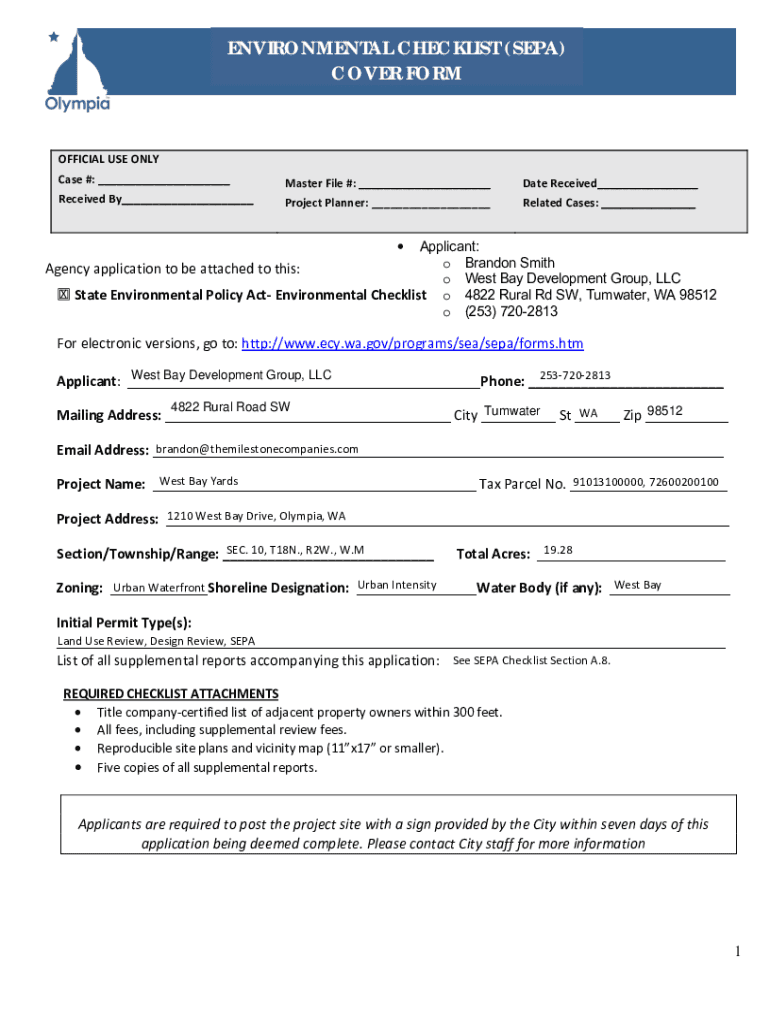 ENVIRONMENTAL CHECKLIST (SEPA) COVER NONOFFICIAL USE ONLY Case #: ___ Received By___Master File #: ___Date Received___Project Planner: ___Related Cases: ___Applicant: o Brandon Smith Agency application