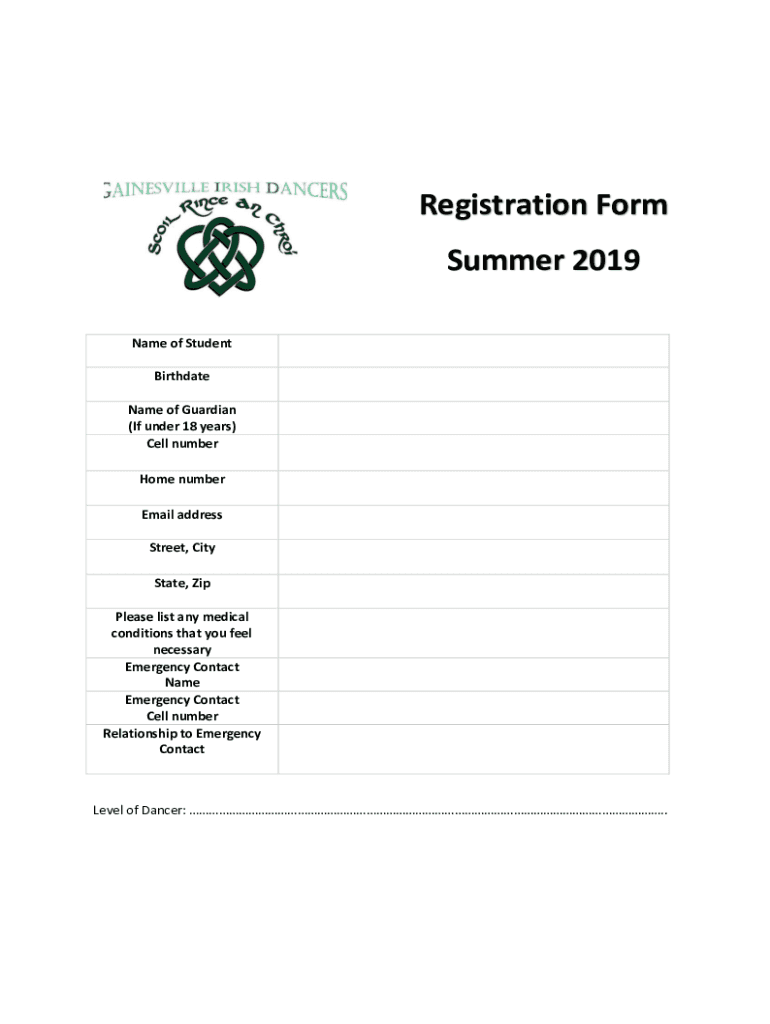 Registration Form Summer 2019 Name of Student Birthdate Name of Guardian (If under 18 years) Cell number Home number Email address Street, City State, Zip Please list any medical conditions that you