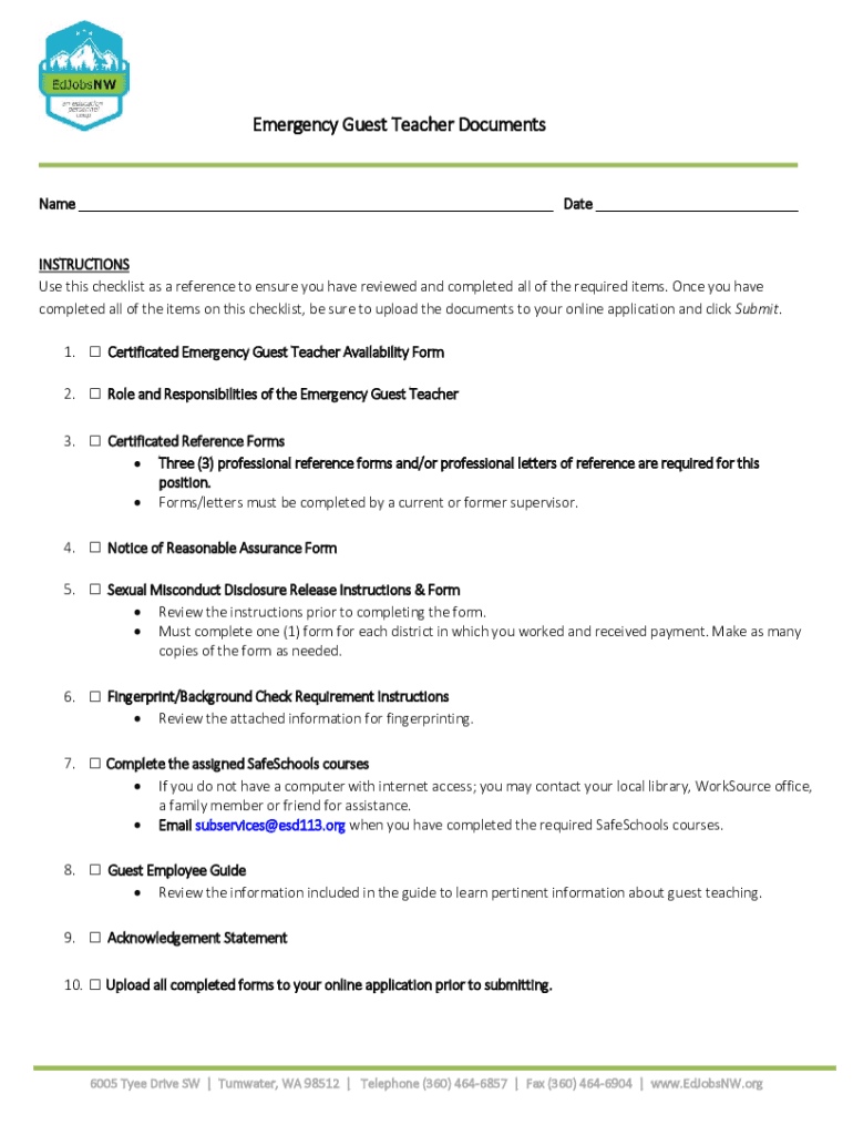 Emergency Guest Teacher DocumentsNameDateINSTRUCTIONS Use this checklist as a reference to ensure you have reviewed and completed all the required items. Once you have completed all the items on this